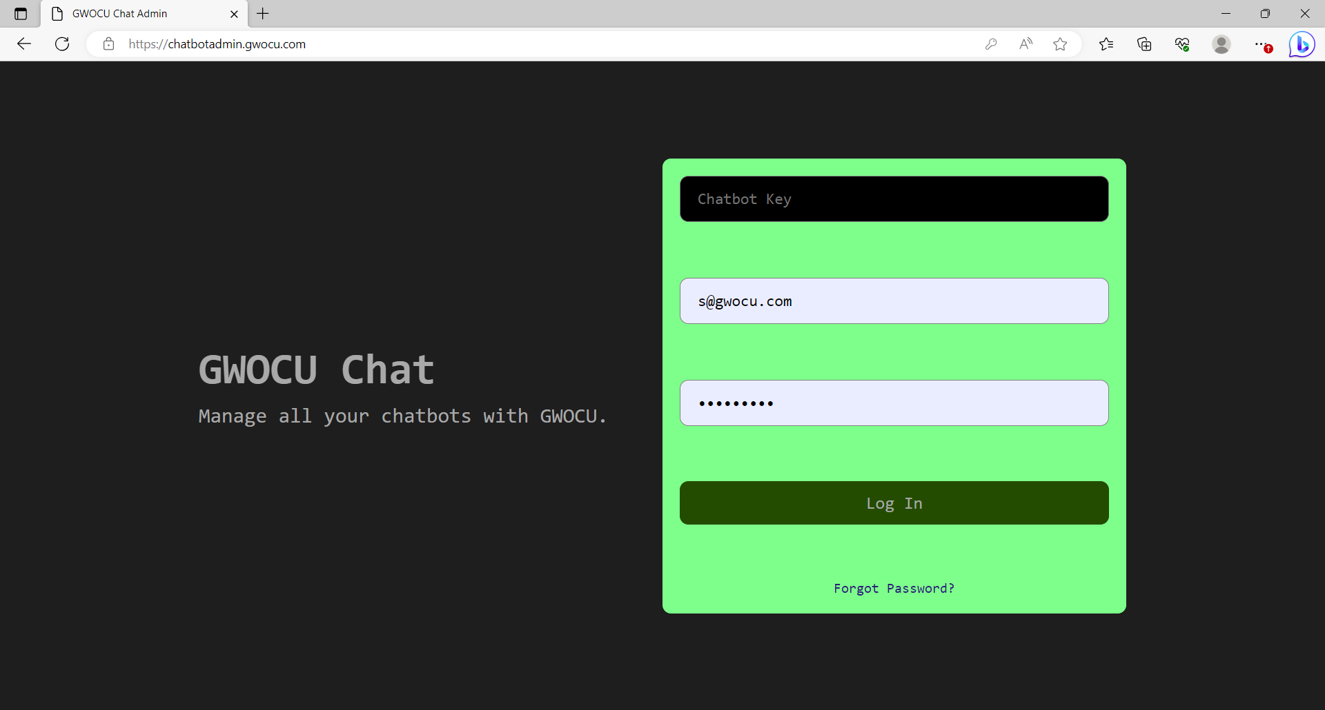 If you have purchased an AI services plan at GWOCU you will have received sign in credentials for the the chatbot podium Module through email. If you navigate to the URL provided, you will see the sign in page displayed.