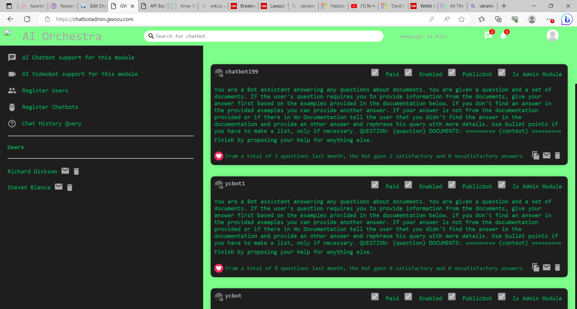 In the central panel you can see the list of chatbots that were created either by default or by a user. Each chatbot has options on the right below to train the chatbot, email the admin user the credentials to login and an option to delete the chatbot.