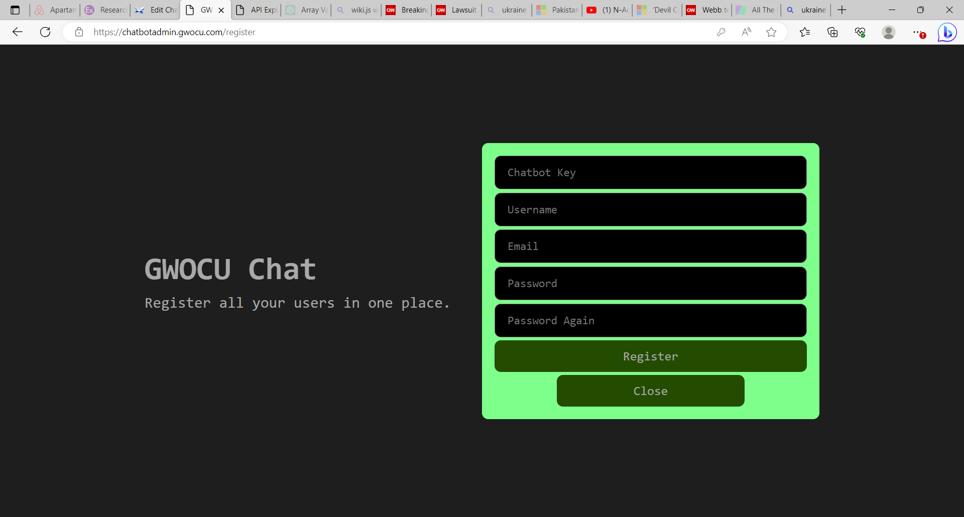 The default chatbot, that is he chatbot that is displayed when you first sign in, has for starters only one user. This is the Admin user. You may create additional users by clicking on the “Register Users” link on the left side panel. You will then be presented with the following screen: